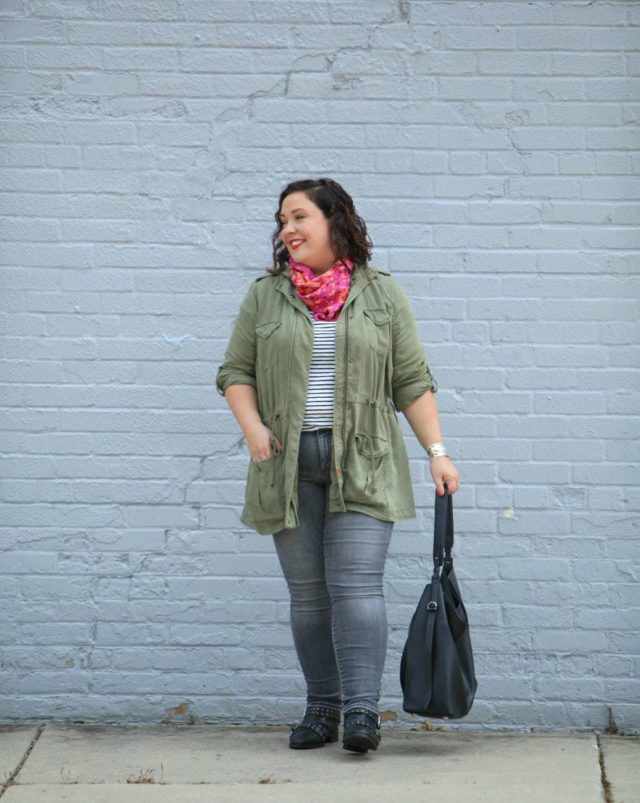 This is one reason I like Dia&Co, I got this jacket and was thinking oh heck no when I saw it, but I tried it on and liked how it's a soft drapey fabric, I can cinch the waist, it's made to have rolled sleeves… it's a good throw on as I run out the door kind of jacket and when paired with a scarf, it makes an old tee shirt and jeans look polished.