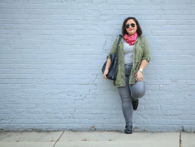 Jacket: Came in one of my Dia&Co boxes (similar) | Tee: J. Crew Factory (XL) | Jeans: Gap (no longer available, similar; plus size option) | Shoes: ASOS (similar) | Bag: ALLSAINTS | Earrings: Kenneth Jay Lane | Bracelet: Had forever (similar look for less) | Sunglasses: Ray-Ban | Scarf: Hermès (similar)